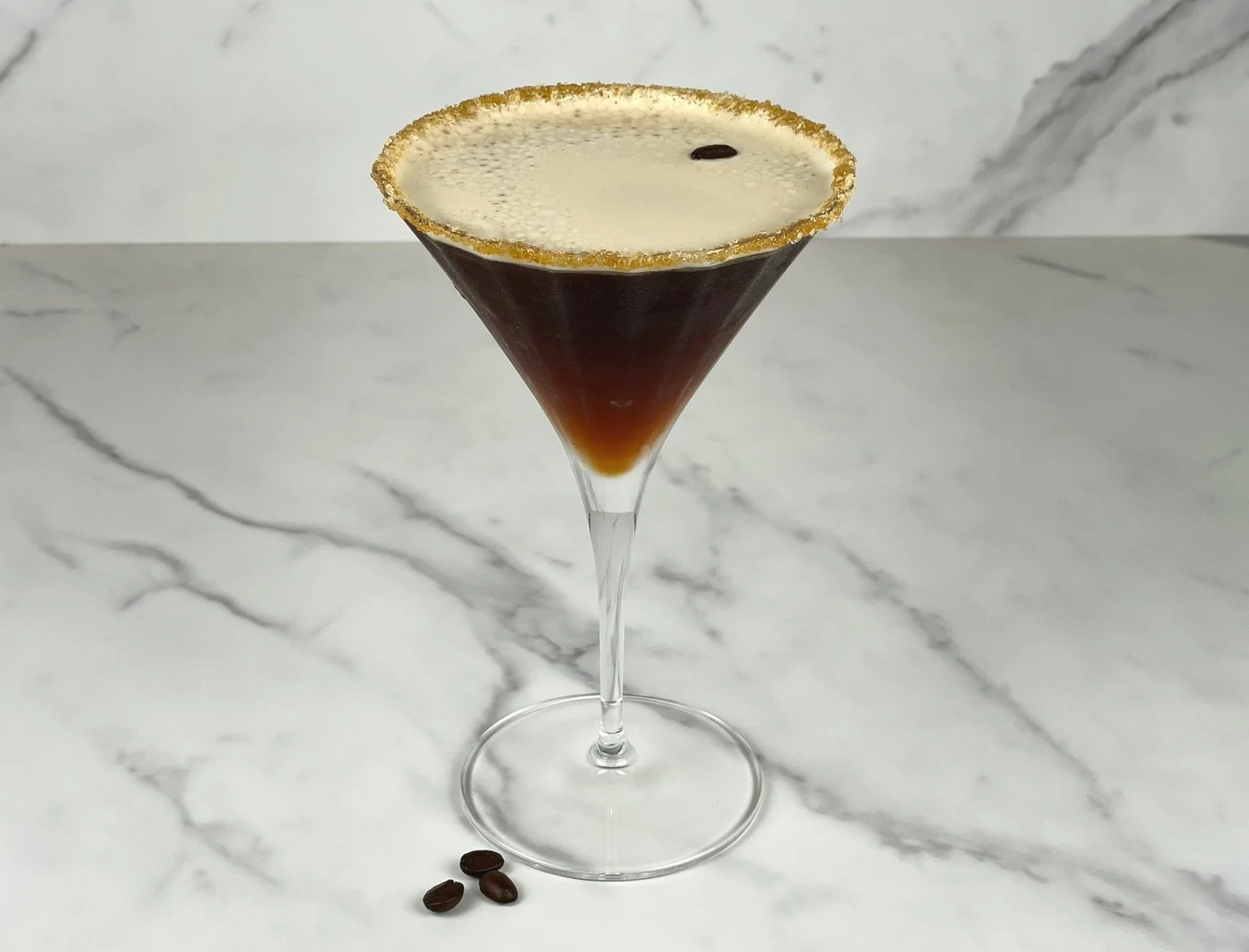This sweet dessert cocktail recipe has only 5 ingredients. The perfect formula for this dessert cocktail starts with a demerara sugar rim, which crowns a beautiful martini glass, and a cocktail shaker filled with ice, bourbon, cold brew coffee, pure maple syrup, and coffee liquor. To get a nice froth, this cocktail must be shaken vigorously for at least 15 seconds (which also makes it a good arm workout!).