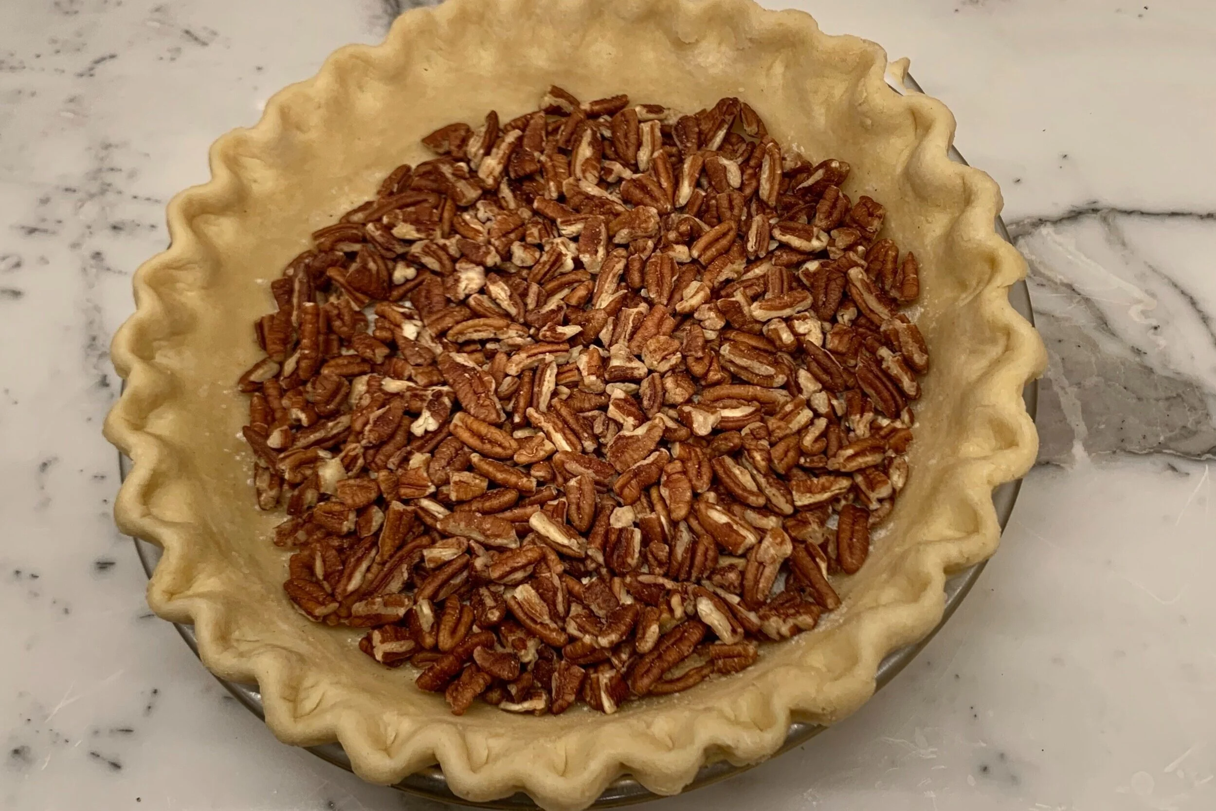 Distribute 2 cups pecan pieces (or roughly chopped pecans) in an even layer in bottom of unbaked crust and refrigerate for 30 minutes (or freeze for 15 minutes).