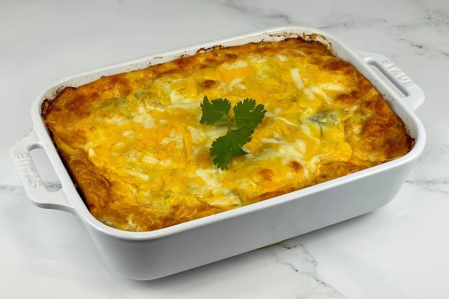 - Bake uncovered for 35-40 minutes, or until melted, bubbly, puffy, and a little golden on the edges. Let cool for 5-10 minutes before serving. While the casserole is cooling, heat Herdez roasted salsa roja (medium - optional garnish). Serve casserole, then spoon warm salsa around the casserole, and garnish with a sprig of cilantro (optional).