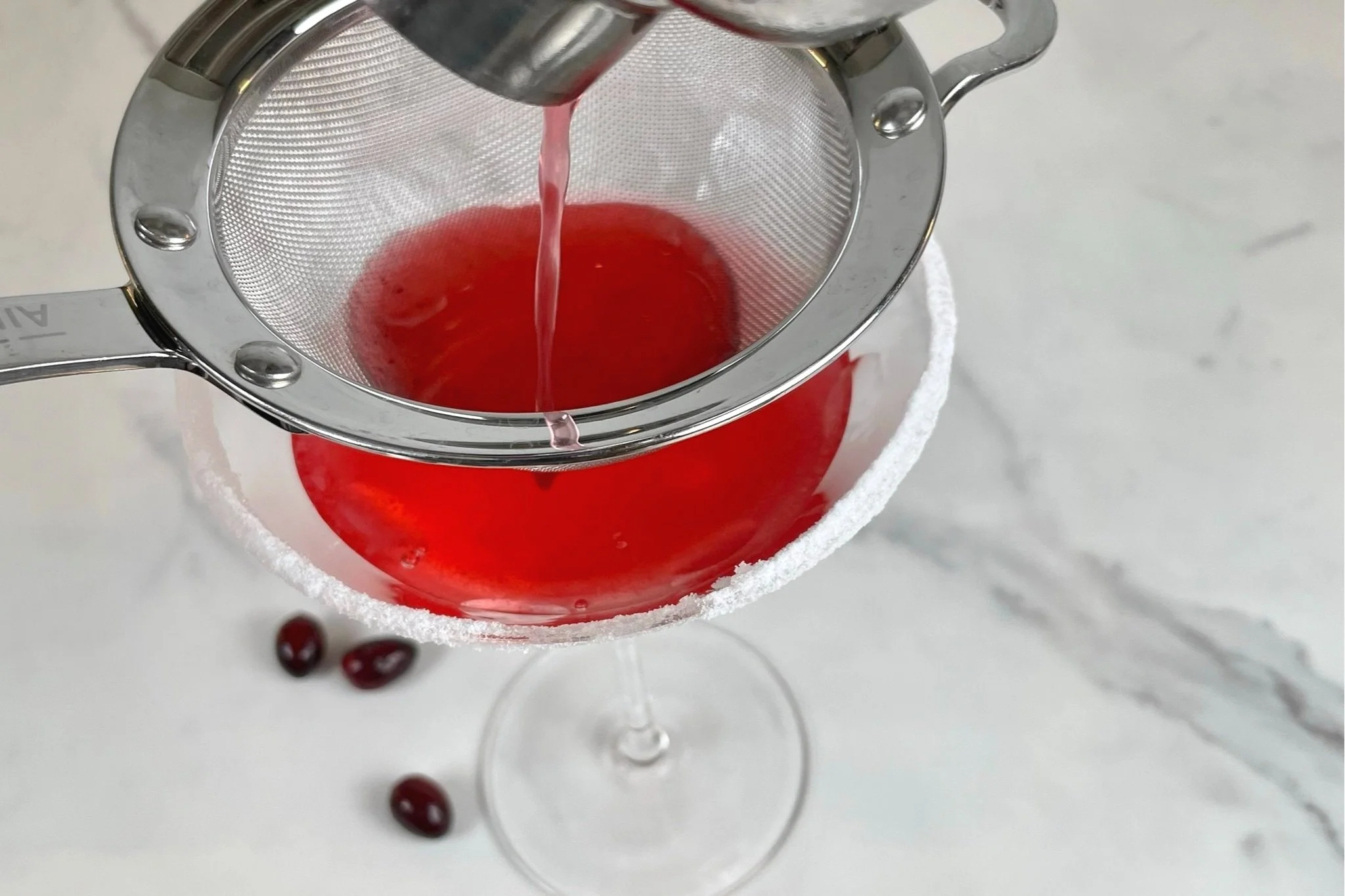 - Using a small fine mesh strainer (or bar strainer), double strain the cocktail into the chilled sugar rimmed martini glass, and garnish with the prepared cocktail pick. Serve immediately, and enjoy!