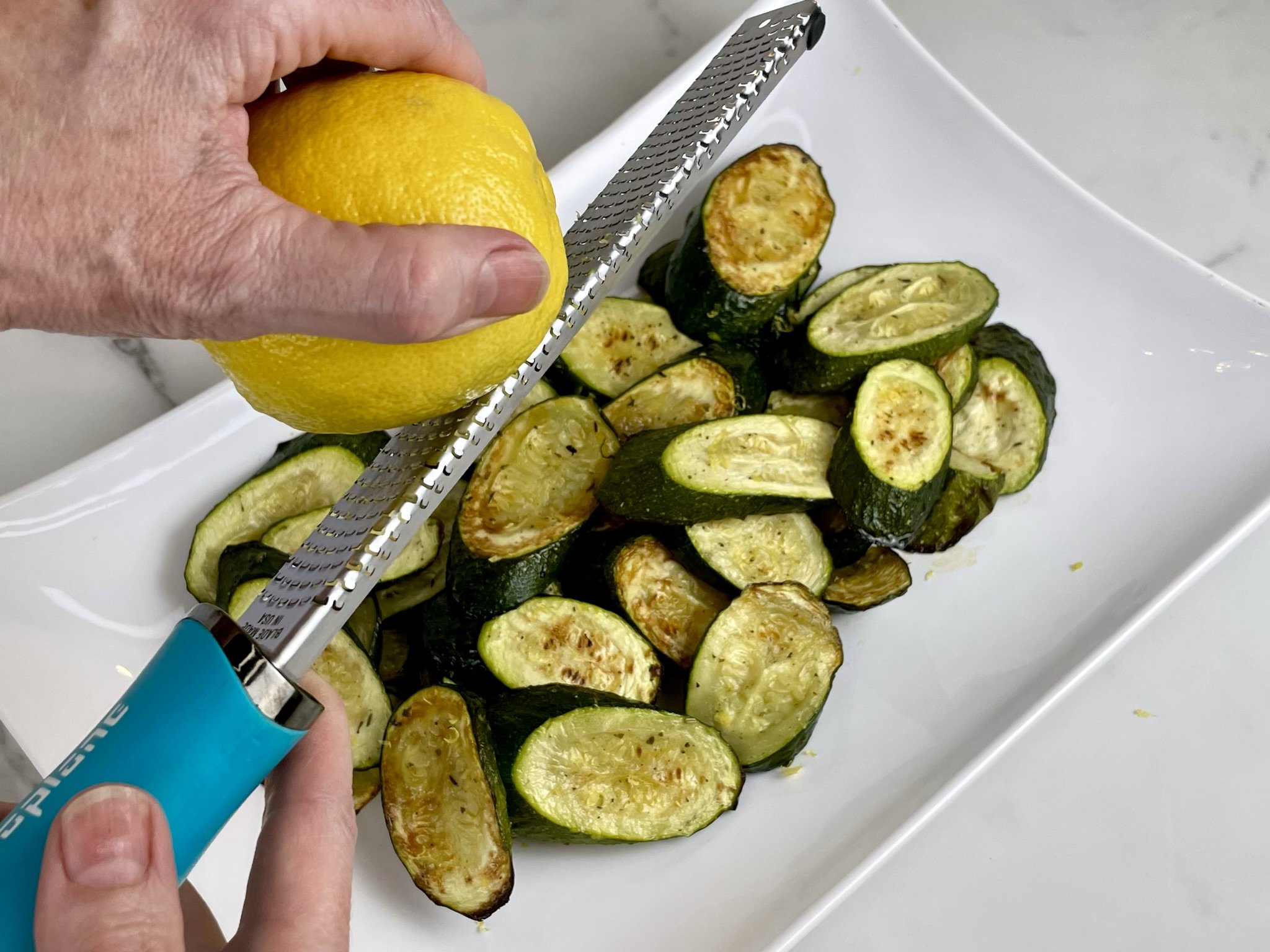 Plate zucchini, and using a fine Microplane zester, grate ¼ teaspoon fresh lemon zest (about ½ a lemon - optional) directly over the zucchini while it’s hot.