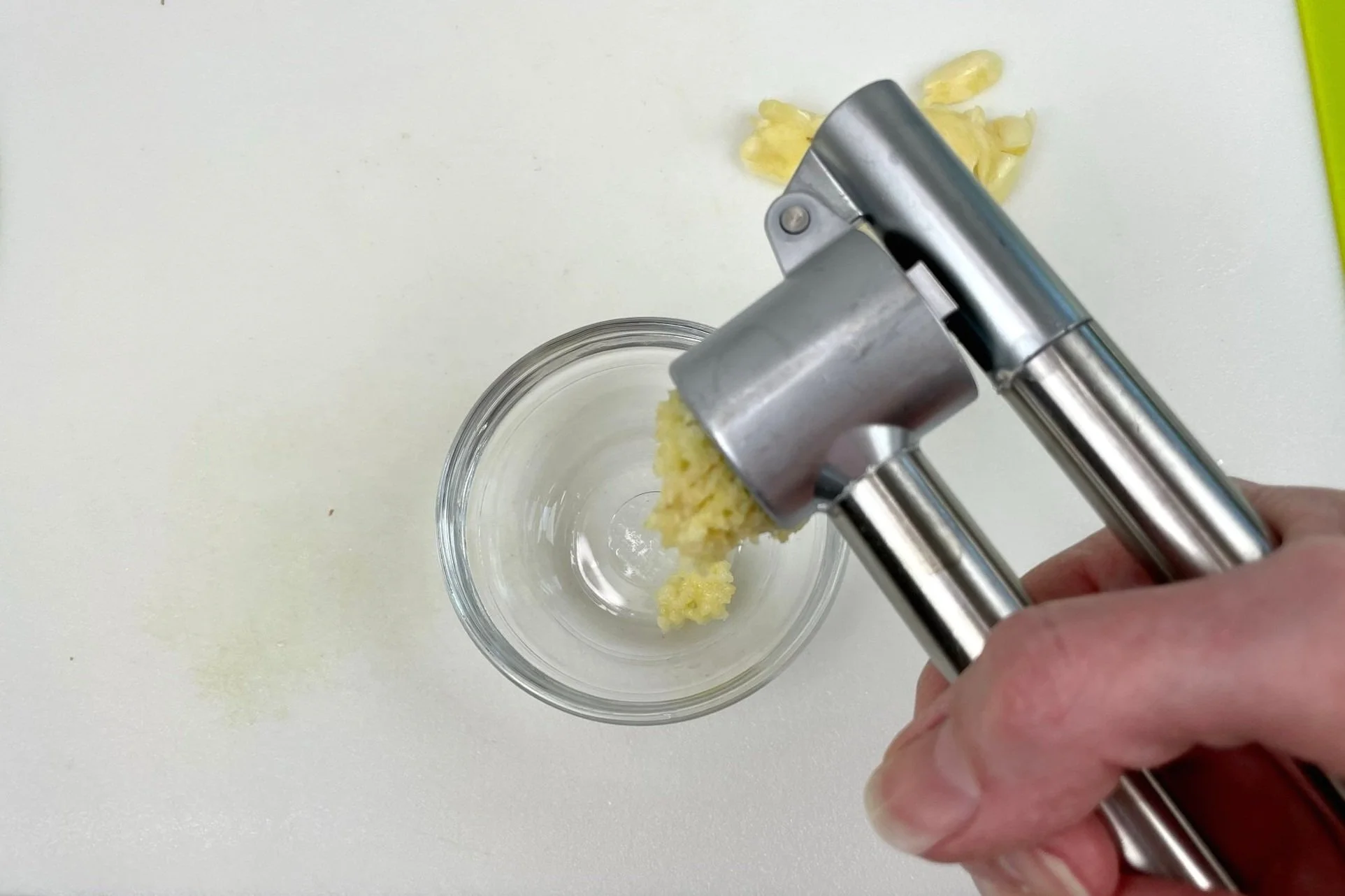 Add 1-2 large garlic cloves to a garlic press, and press to yield 1 teaspoon pressed garlic (or finely grate using a Microplane grater), and set aside.
