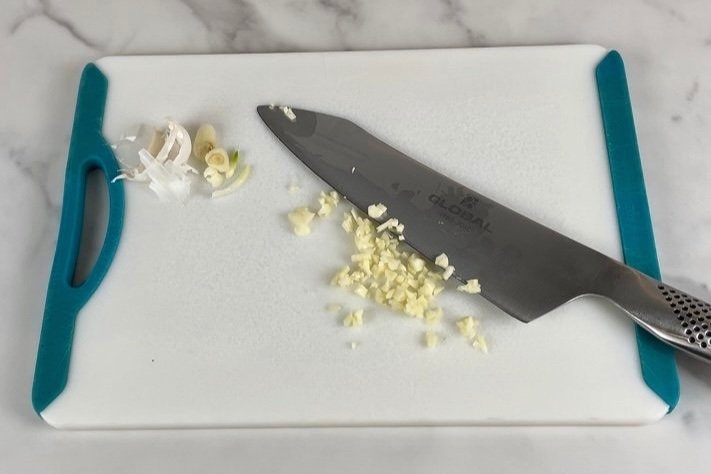 - Using a sharp chef’s knife, cut off the ends of zucchini. Quarter each zucchini lengthwise, then slice crosswise into 1 inch thick pieces (or large dice). Mince garlic cloves, and set each ingredient aside.
