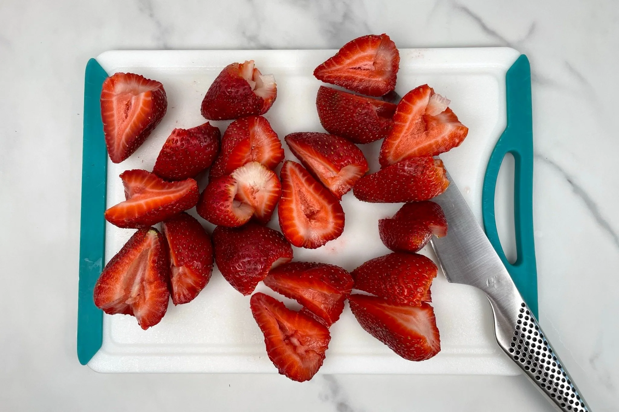 Halve or quarter 5 cups fresh strawberries, depending on the size of the berries (each piece should be bite size).