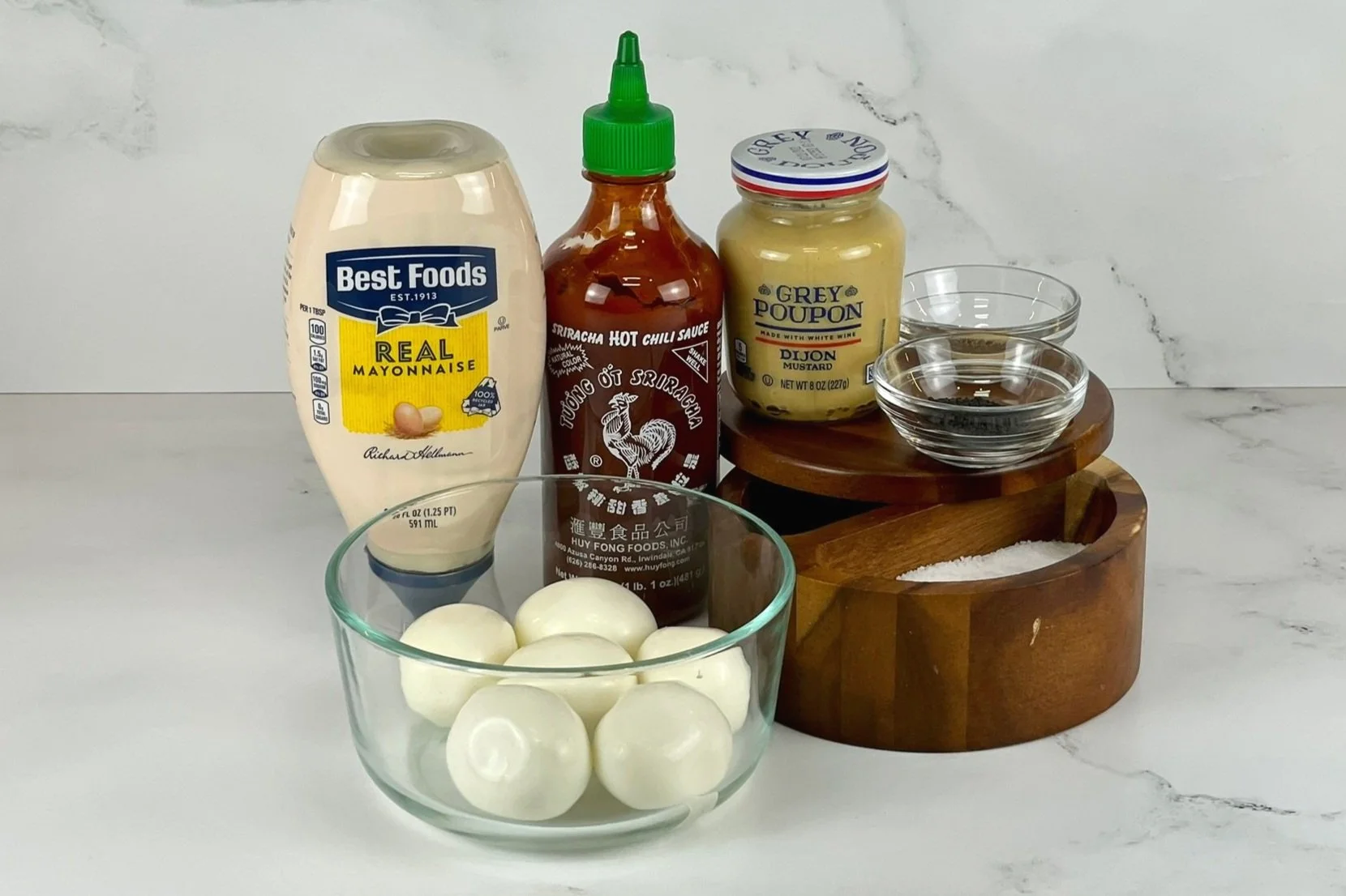 - To the processed egg yolks, add mayonnaise, Sriracha, and mustard, and process until combined and smooth (scrape the bowl halfway through). Taste for seasoning, and adjust if needed. Once processed, stir with a spatula to make sure all ingredients are combined.