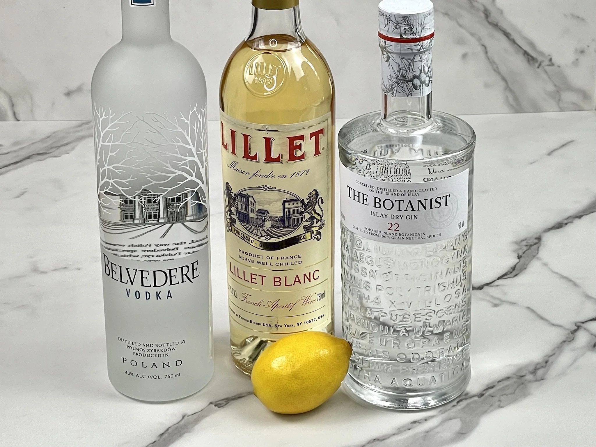 High quality alcohol. We used Lillet Blanc, The Botanist Gin, and Belvedere Vodka. In our opinion, there is no substitute for Lillet Blanc in this drink. You can use your favorite gin or vodka, but we like the combined aroma and taste of this particular vodka and gin.